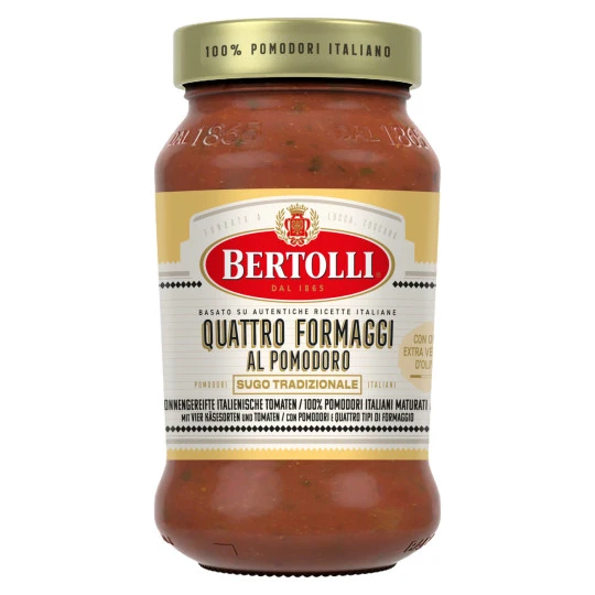 Die Bertolli Pasta Saucen Kreation Quattro Formaggi al pomodoro mit ausgewählten italienischen Käsesorten und mit 100% italienischen Tomaten, verfeinert mit Bertolli extra vergine Olivenöl passt gut zu jeder Pasta.